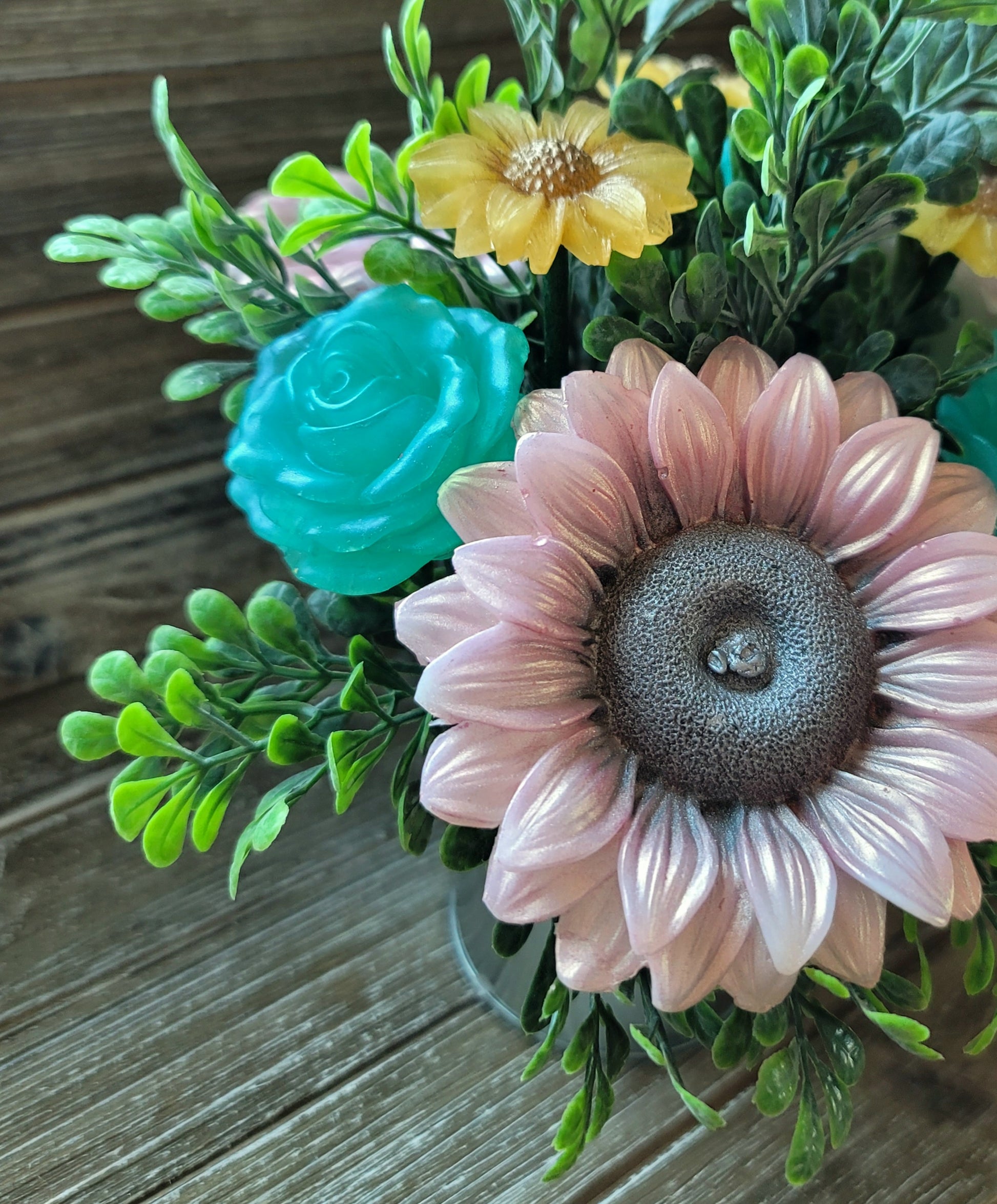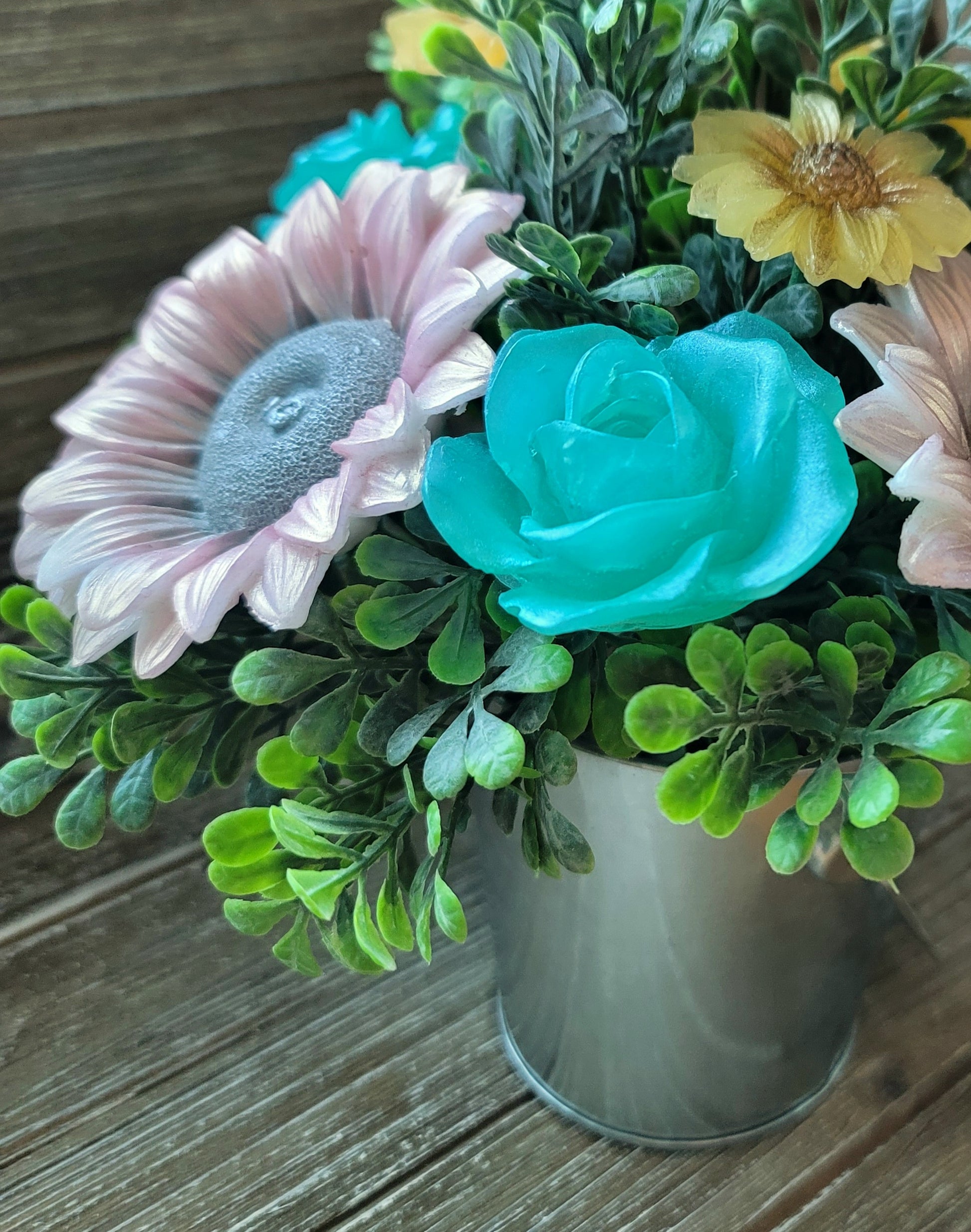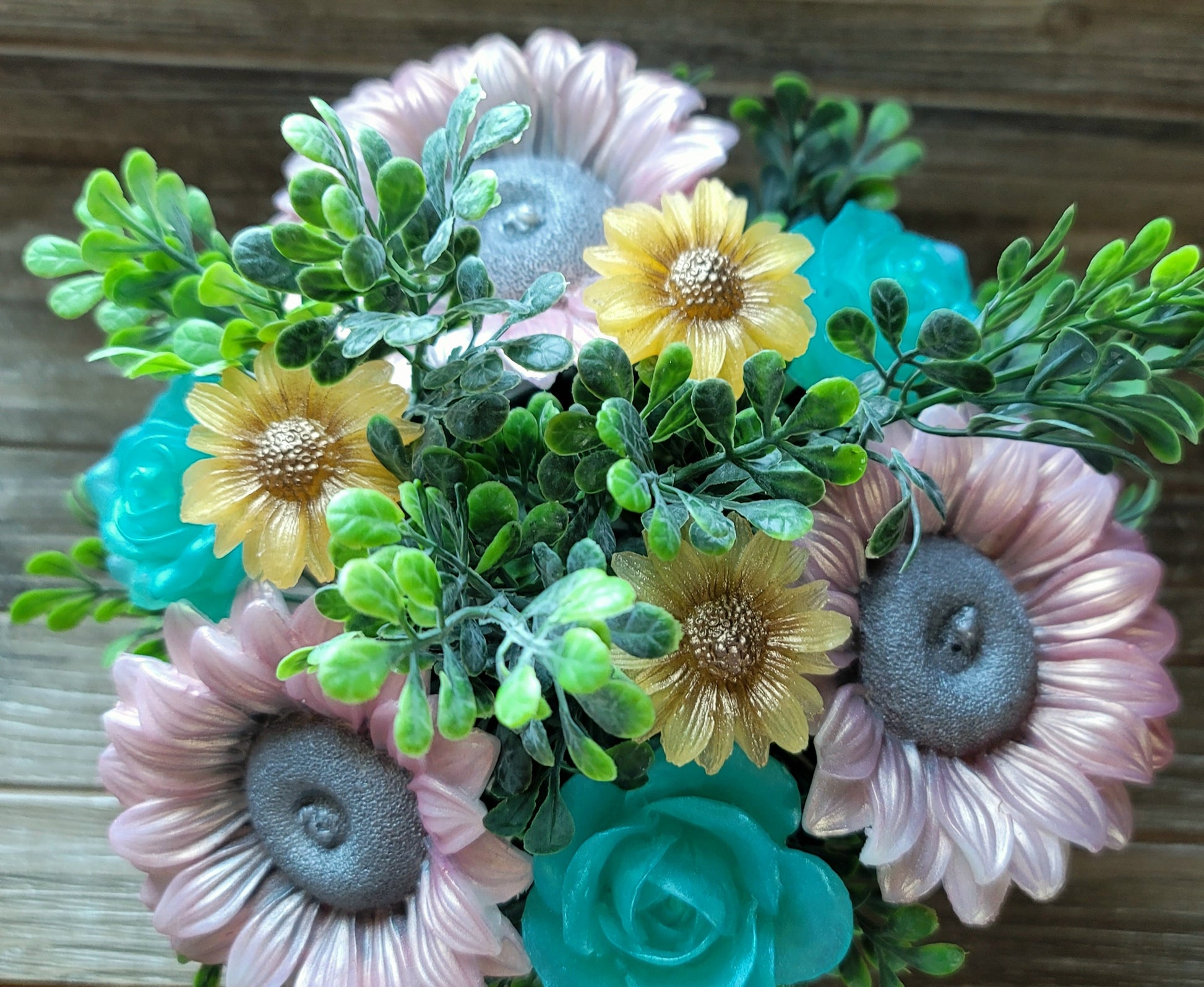 White Iridescent Sunflower & Teal Rose Soap Bouquet