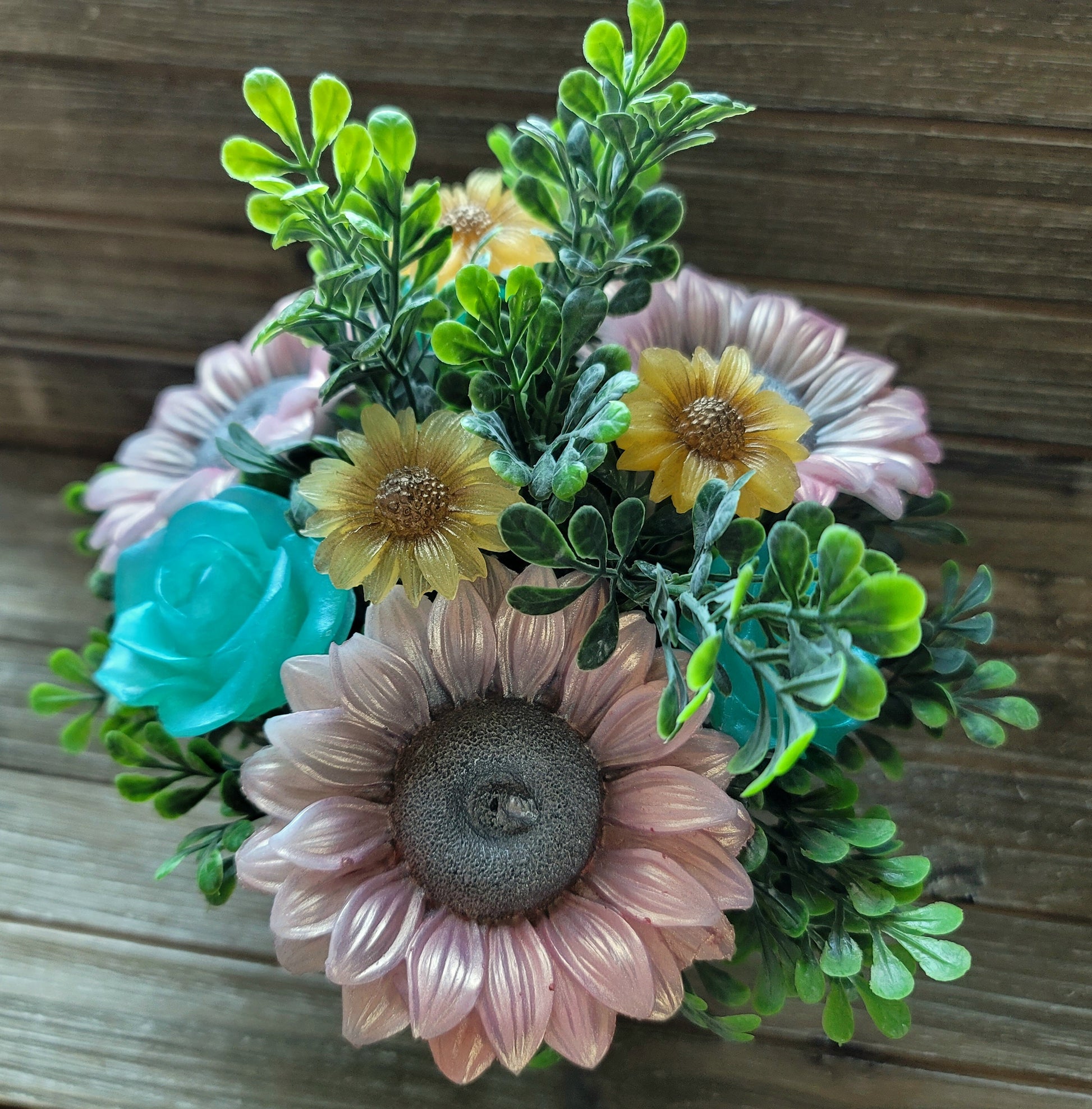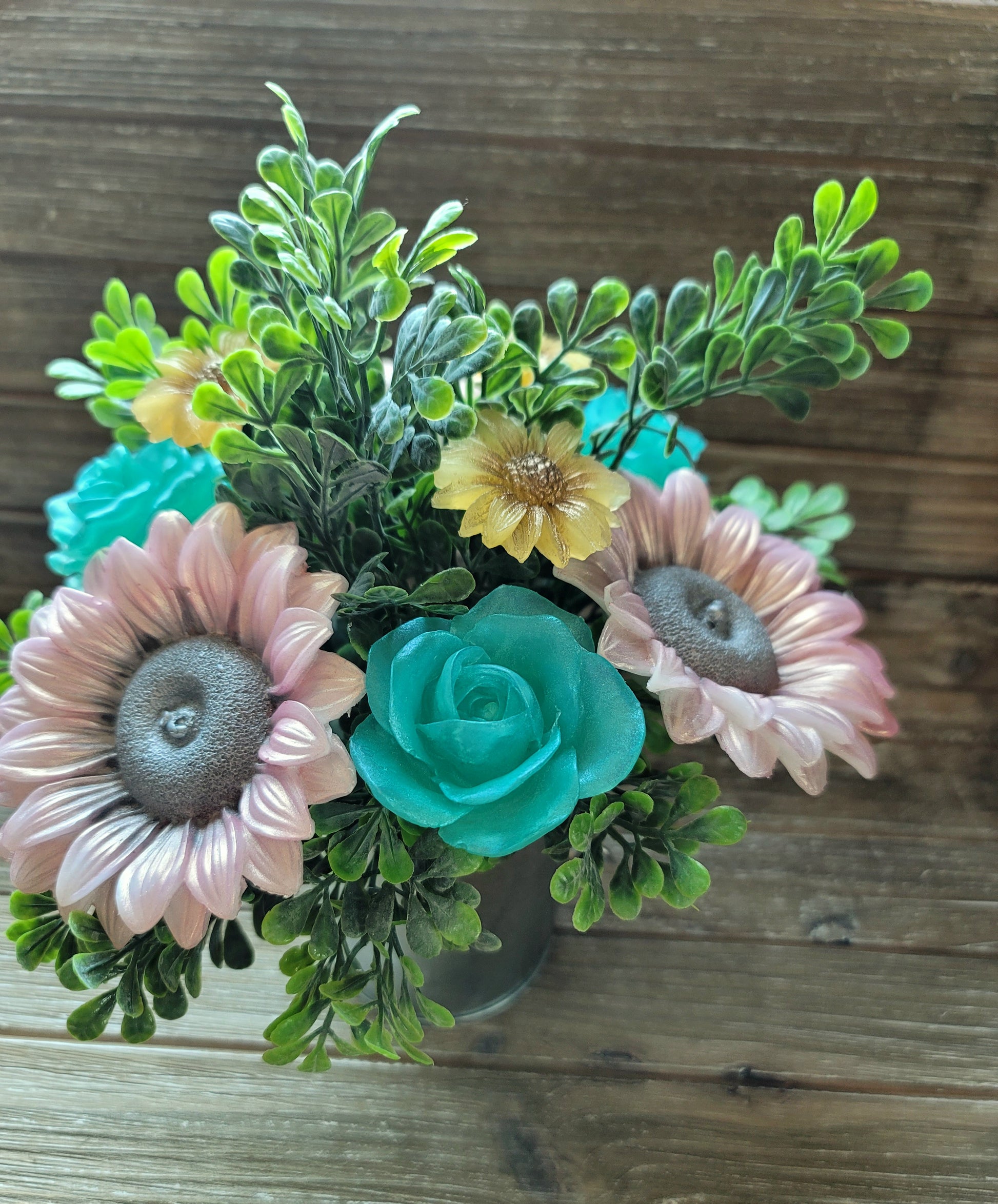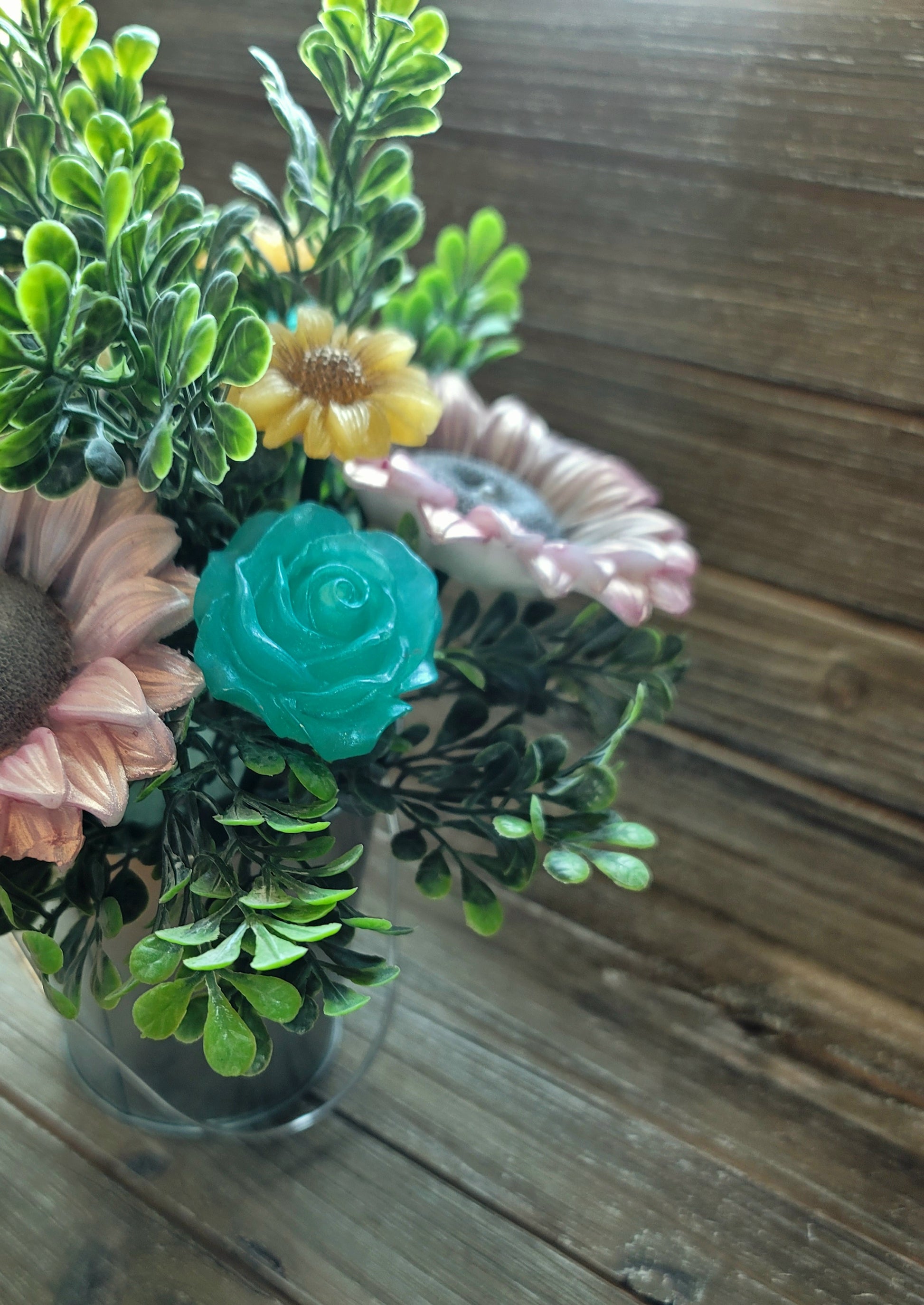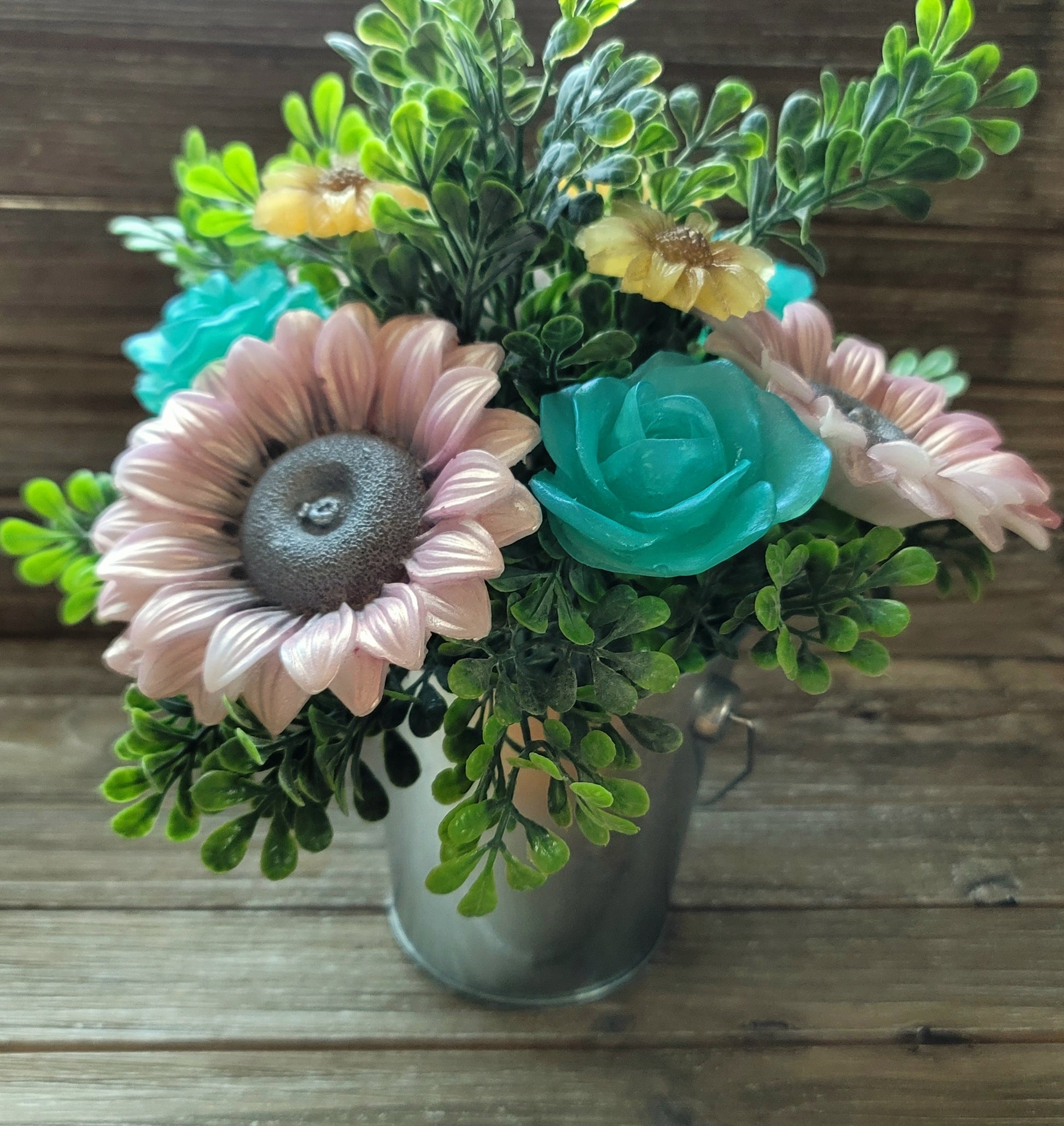 White Iridescent Sunflower & Teal Rose Soap Bouquet