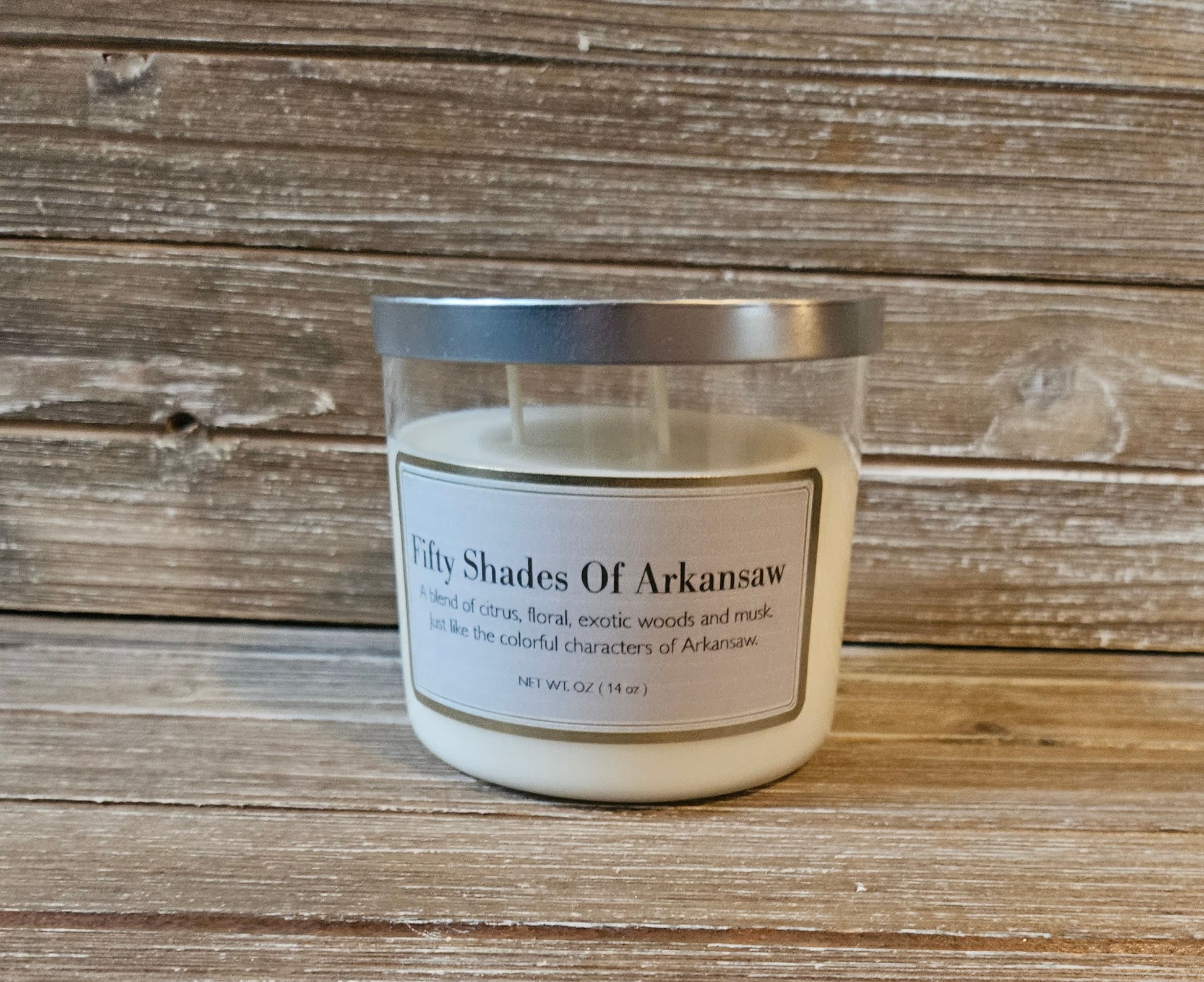 Get in the mood with our Fifty Shades Of Arkansaw Candle. This 3 wick soy candle provides clean burning for up to 14 ounces of fun. Let the soy wax enhance your senses as you light up this unique and playful candle. (Don't worry, it's not as scandalous as it sounds.)