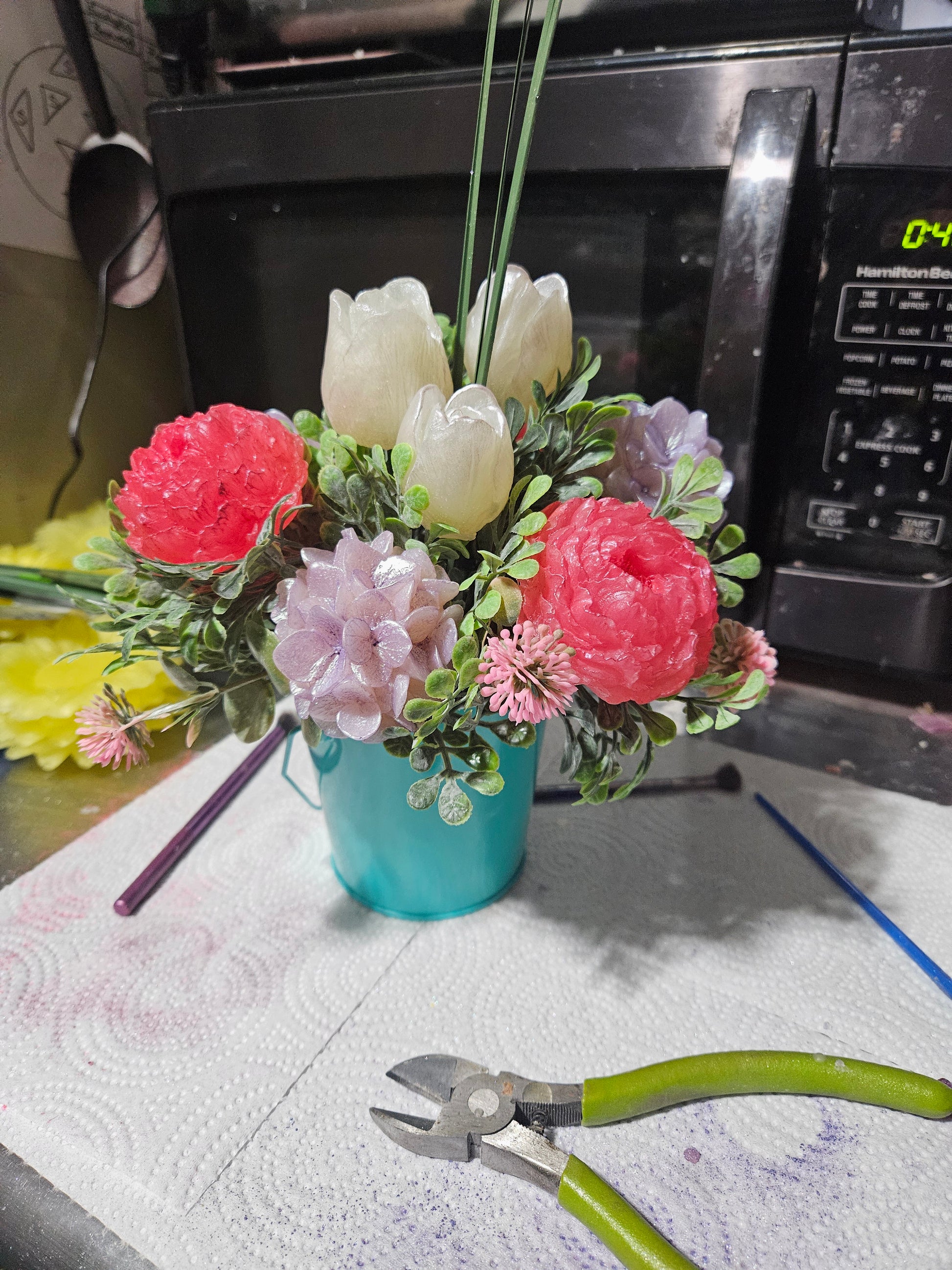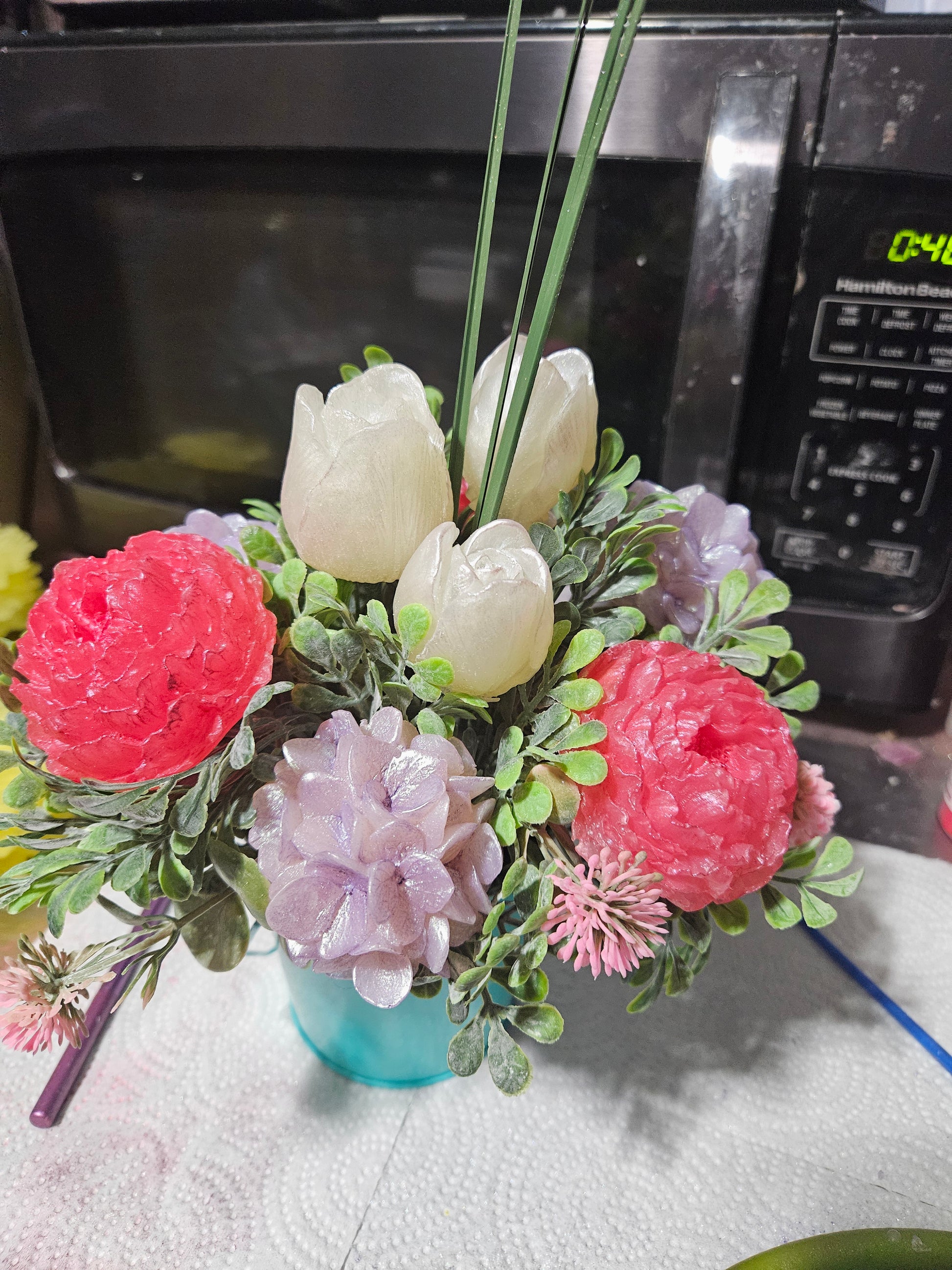 Cleanse your senses and indulge in a whimsical floral bouquet with our Mixed Soap Tulip Bouquet. Featuring soap petals scented with refreshing cucumber and other floral notes, this arrangement includes tulips, peonies, and hydrangea, adding a touch of beauty to your bathing experience. (Rub-a-dub-dub, it's a bouquet in your tub!)